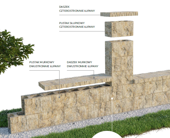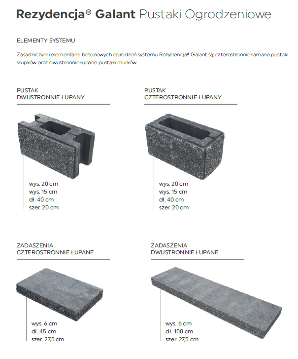 Zasadniczymi elementami betonowych ogrodzeń systemu Uni-Split® są: czterostronnie łamane pustaki słupków oraz dwustronnie łupane pustaki murków. Wszystkie pustaki posiadają wymiary 40x20x20cm oraz podfazowania 10x10mm kształtujące spoiny. Ogrodzenie przęsłowe stosowane jest zazwyczaj jako frontowe ogrodzenie posesji. Możliwe są również płynne przejścia z przęseł do muru pełnego w różnych sytuacjach w tym tworzenia zasłon widokowych.