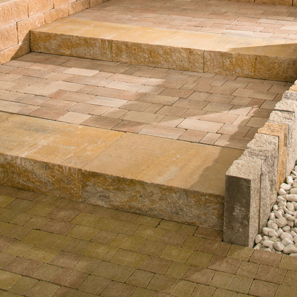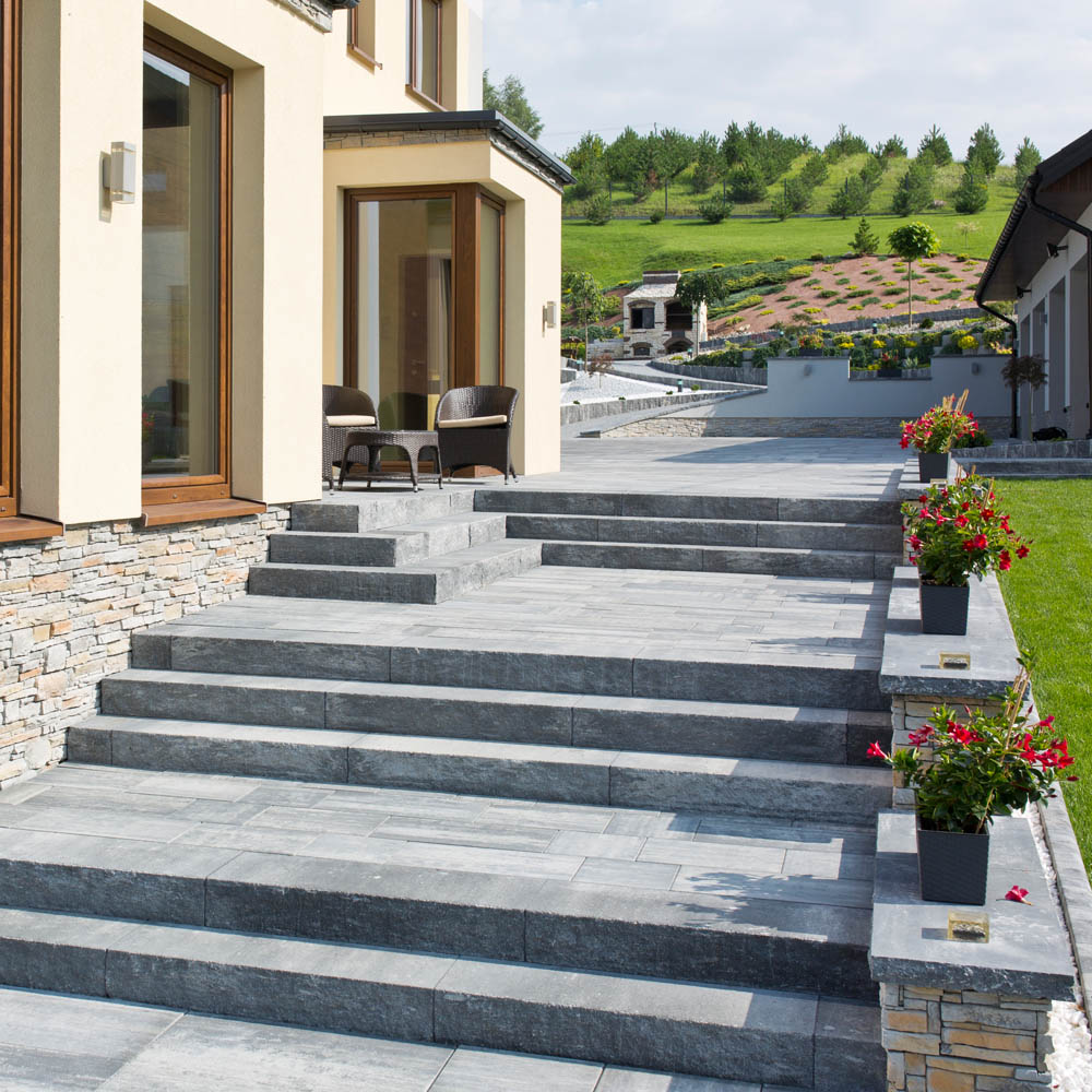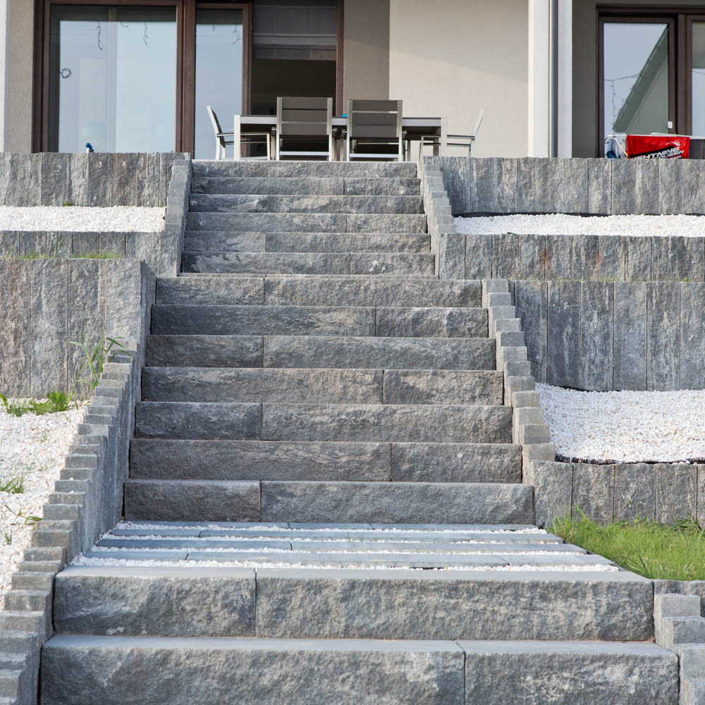Bloki schodowe UNI SPLIT® doskonale współgrają z palisadami, cegłą łupaną, blokami ogrodowymi UNI SPLIT®. Dzięki dużym rozmiarom pozwalają na szybkie wykonanie gotowych schodów w naszym ogrodzie.