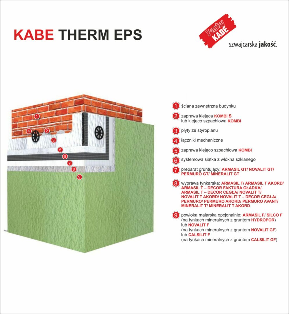 KABE THERM EPS to nowoczesny system ociepleń ścian zewnętrznych oparty na styropianie*, przeznaczony do szerokiego zastosowania w budownictwie mieszkaniowym jedno- i wielorodzinnym, obiektach użyteczności publicznej oraz budownictwie przemysłowym. System może być stosowany do wysokości 25 m (lub do 11. kondygnacji w budynkach wybudowanych przed 01.04.1995 r.), a także w konstrukcjach szkieletowych.