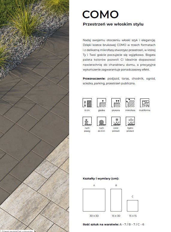 Kostka brukowa COMO dostępna jest w trzech praktycznych formatach, ma grubość 6 cm i posiada delikatną mikrofazę, która podkreśla jej stylowy charakter. Precyzyjne wykonanie każdego elementu sprawia, że doskonale sprawdza się zarówno przy prostych, jak i bardziej wymagających, kreatywnych aranżacjach.