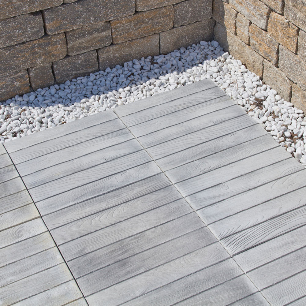 Ogrodowy. Płyty o rozmiarach 45×45 cm w trzech wzorach i 60×60 cm w dwóch wzorach i czterech wersjach kolorystycznych imitują parkiet, wraz z odwzorowaniem naturalnego usłojenia drewna i dają zupełnie nowe możliwości aranżacyjne. Płyty parkietowe sprawdzą się znakomicie w większości stref w ogrodzie: od tarasów, przez ścieżki i placyki, po altany ukryte wśród drzew.